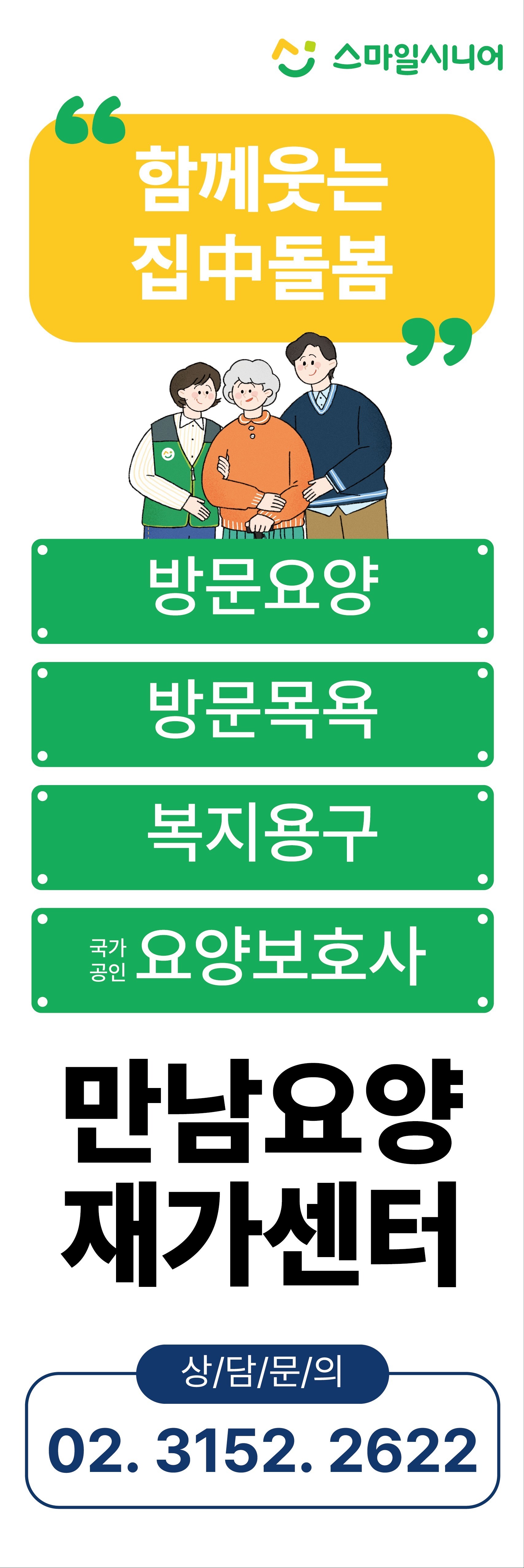 ![]() | ![]() | 1. 방문요양 2. 방문목욕 3. 방문간호 4. 등급신청 5.국비지원 6.무료방문상담 7. 우리가족돌봄서비스 8. 국가공인요양보호사 |